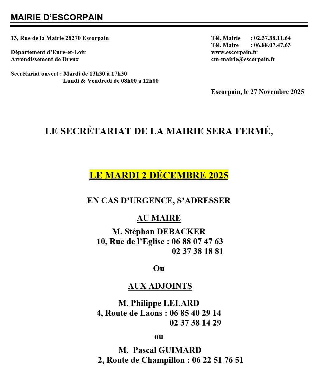 Le secrétariat de la mairie sera fermé le 2 décembre 2025