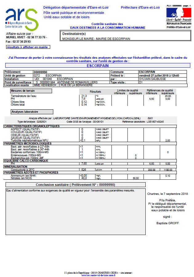 Bulletin concernant les résultats des analyses d’eau