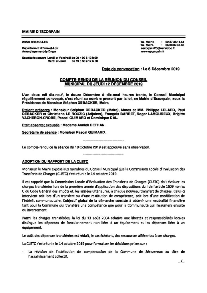 COMPTE-RENDU DE LA RÉUNION DU CONSEIL MUNICIPAL DU 12.12.2019