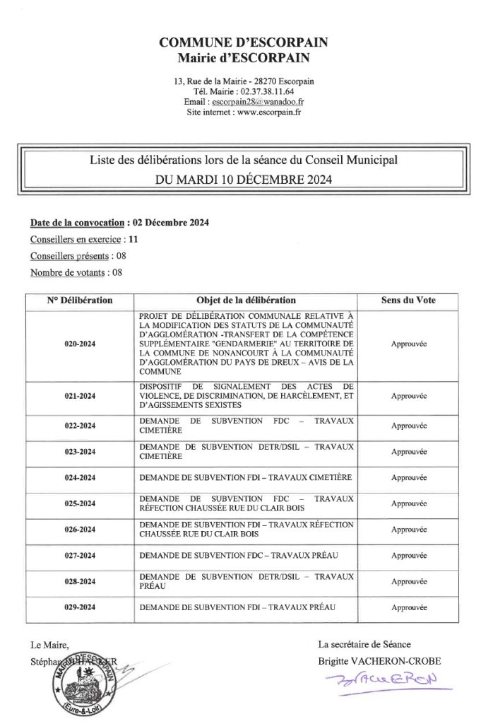 Liste des délibérations lors de la séance du Conseil Municipal du mardi 10 décembre 2024